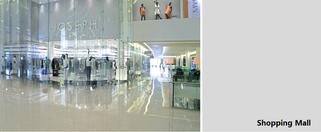 「整体地面」是一系列专门针对商业公共空间而设计的地面系统,由环保高分子聚合物材料及聚合物砂浆材料加各种不同特色的填料组成,针对不同的应用需求进行定制的无缝地面系统。采取现场整体成型施工工艺,具有大面积整体无缝,自由图案设计,个性色彩搭配以及耐久性等特性,适用于「机场候机楼、购物中心、文化场馆及酒店会所等公共空间 」。