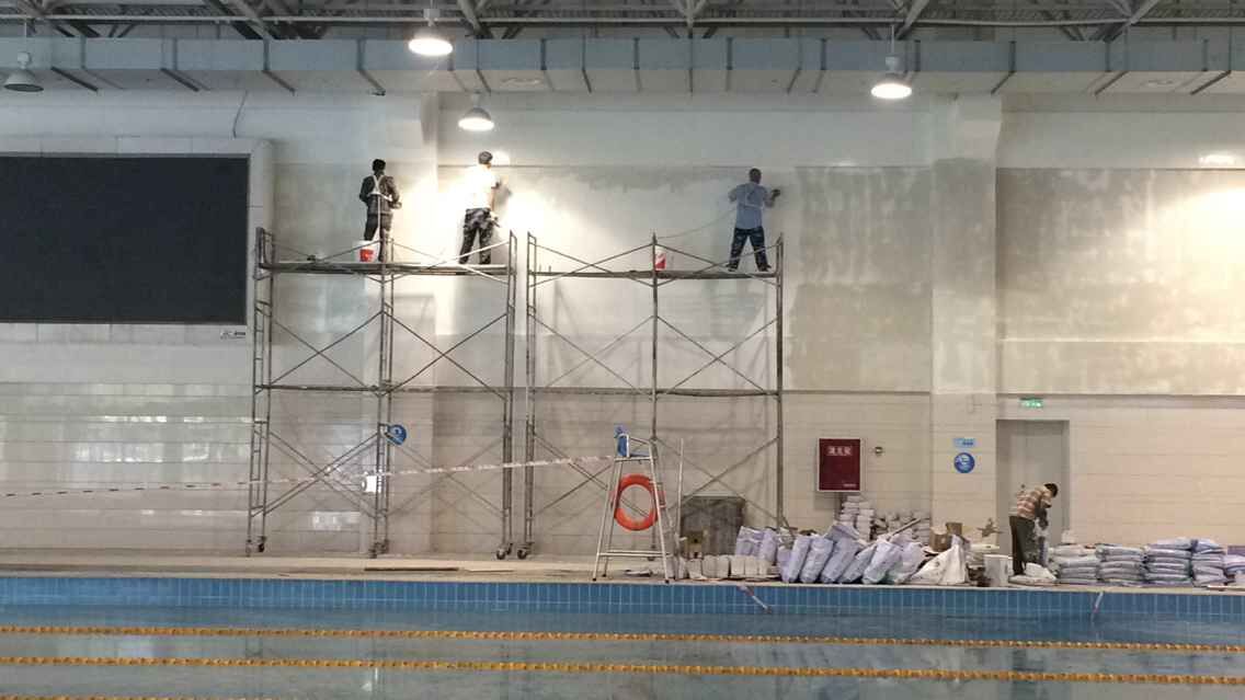 该项目游泳池原有墙面为墙砖,目前已出现墙砖脱落现象,给游泳池内过往行人来带了很大的安全隐患。此次墙面防水修复工程,我司采用高弹性聚脲防水保护一体化方案……